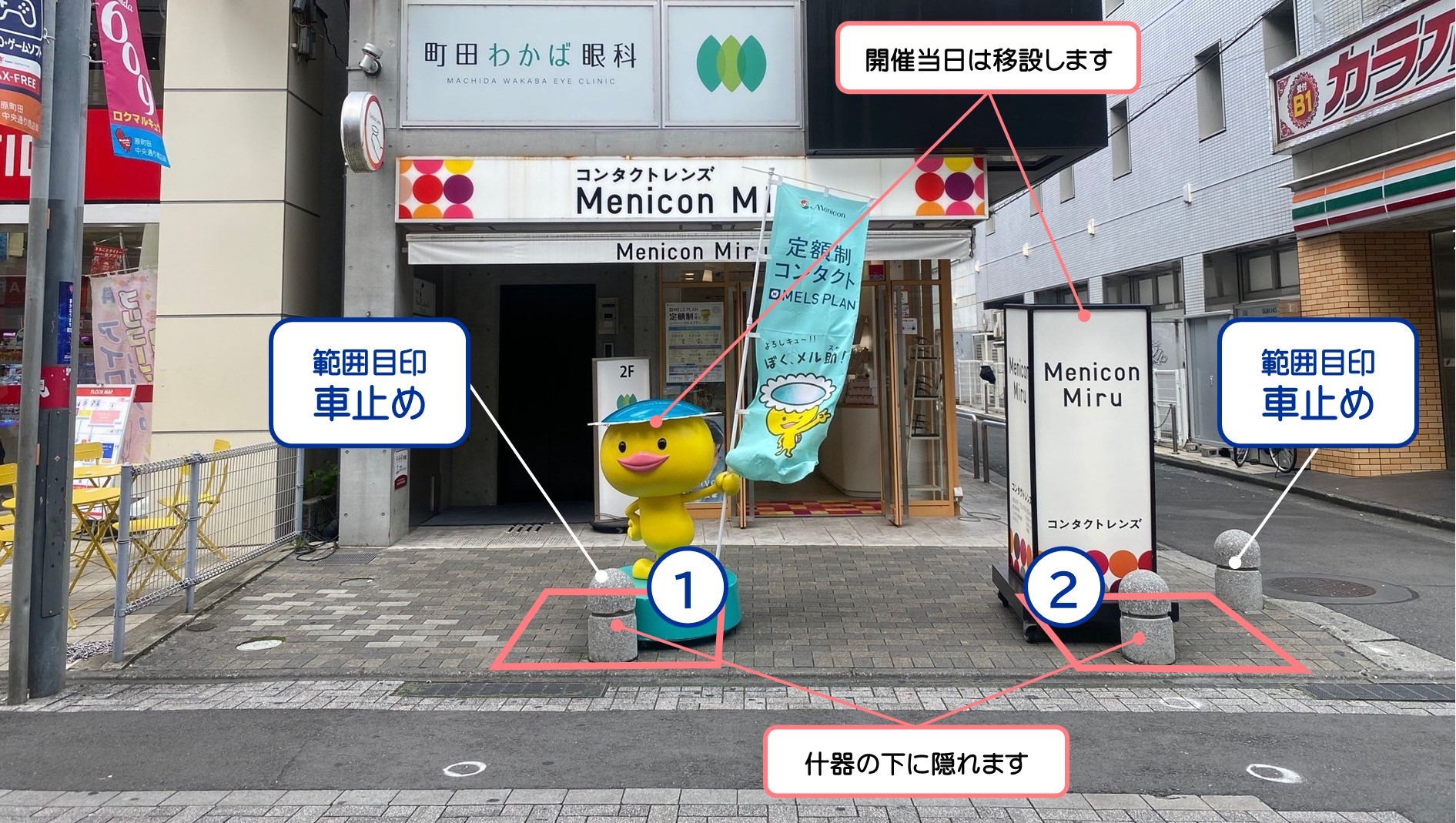 ・③と店舗の間は歩行者が多いため、荷物で塞がないよう気をつけるとともに、貴重品管理に注意してください。